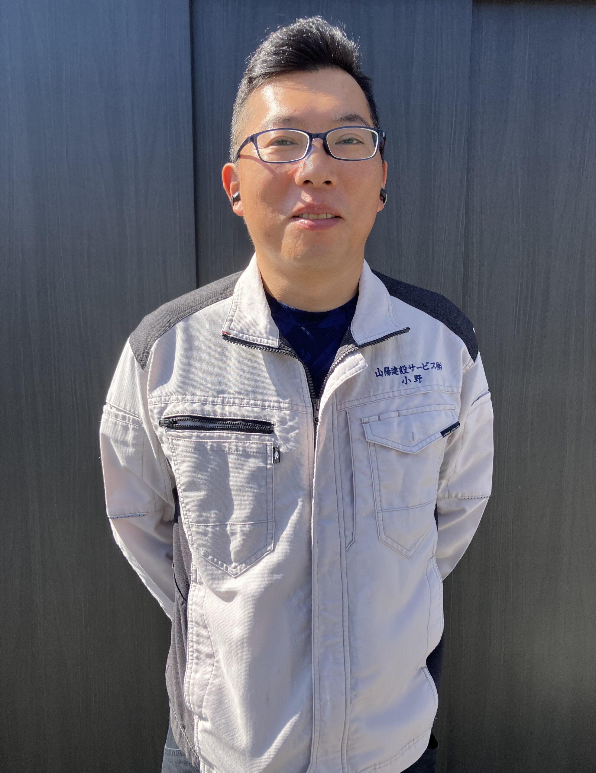 小野晋二郎です。係長として、現場管理(元請工事、下請工事の両方)を中心に、現場作業にも携わっています。